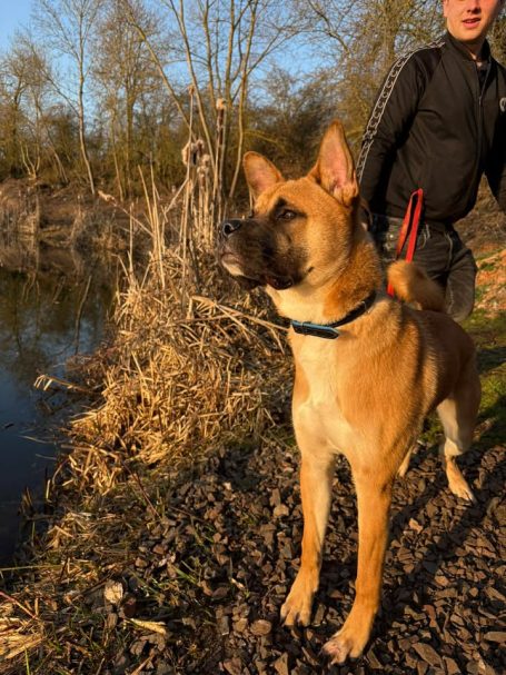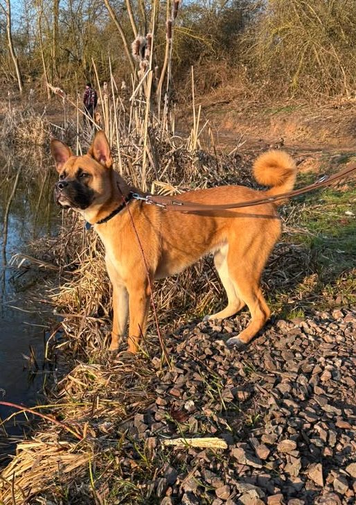 Eddi wurde leider angeschafft ohne sich über die Rassen zu informieren, mal abgesehen davon das es eine sehr unüberlegte neue Mischung ist, bringt natürlich ein Akita ganz andere Gene wie ein Boxer mit. Eddi wurde nicht konsequent erzogen und hat die Halter haben ihn wenig Sicherheit geben können, dadurch ist er extrem Unsicher und kann ohne den Halt seiner Bezugsperson auch nach vorne gehen. Er ist verträglich mit anderen Hündinnen, diese sollten aber auch eine stattliche Größe haben sodass er sie nicht überrumpeln kann. Bei katzen ist er eher zurückhaltend und besitzt wenig Jagdtreib. Wir suchen für Eddi einen Menschen oder ein paar die vieleicht schon Akita erfahren sind oder sich mit den Charakter auskennen. Menschen die einen Hund lesen können und wissen wann aus den Spiel ein Test wird. Jemand der Zeit hat hat sich diesen kleinen Kasper anzunehmen der mit seiner Besugsperson ganz groß sein kann und vor jeden Fremden eine Riesen Angst hat. Es kostet Arbeit und Nerven aber es lohnt sich, denn einmal ins Herz geschlossen ist es ein Band für immer! Am liebsten hätten wir für ein Haus mit Grundstück welches Fest und ordentlich hoch eingezäunt ist, so dass er auch eine Aufgabe hat wenn niemand Zuhause ist.